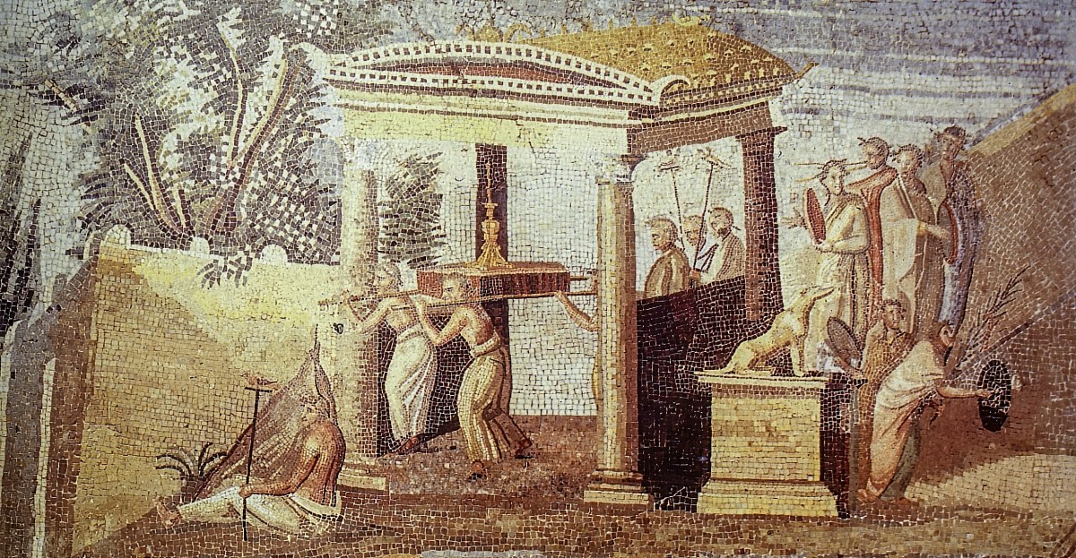Although heavily stylised, the mosaic accurately portrays much of the landscape, flora and fauna of the region. It has been interpreted variously as a scene of the hunting of war Elephants by the Ptolemies, or a religious festival linked to the Isis cults. Indeed in the bottom right hand corner, a procession can be seen carrying a sarcophagus. Many see this as an idealised (i.e. Classical) images of the Osiris procession at Abydos (which is in this region of Egypt). Meyboom argues that the landscape showed the abundant landscape of Isis, and was thus a promise of the benefacts that she could offer her adherents.