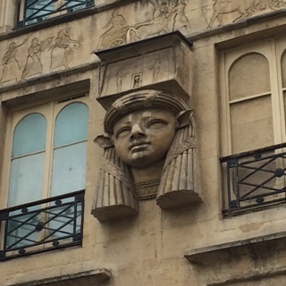 The Passage du Caire is the oldest covered arcade in Paris. It was built in 1798. It is fronted with depictions of the goddess Hathor, Egyptian columns and cavetto cornice, and an Pharonic frieze. A fine piece of urban architecture, it was being renovated when we visited.
