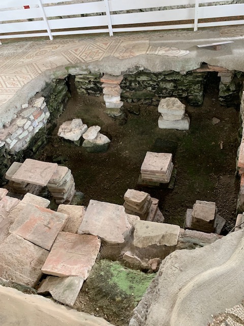 An underfloor heating system (hypocaust) is partly exposed beneath the floor.