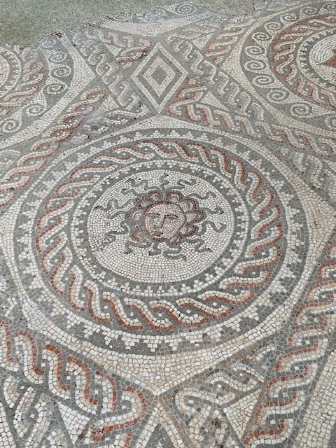 Perhaps the most famous of the mosaics is the Medusa centrepiece which was originally located in the changing room of the bath complex. A very effective mosaic depicting a woman’s head surrounded by flowing locks and writhing snakes. She is a friendly figure welcoming intrepid bathers.