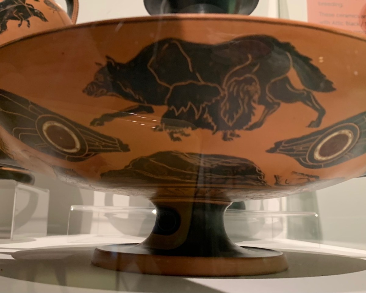 Further along in the museum, you can also see some of the objects which likely inspired Alison. A cup by the Euergides Painter depicts a greyhound type dog, scratching his ear with his paw. An amphora painted by the Diosphos Painter, depicts a dog playing at the feet of a warrior about to depart for war.