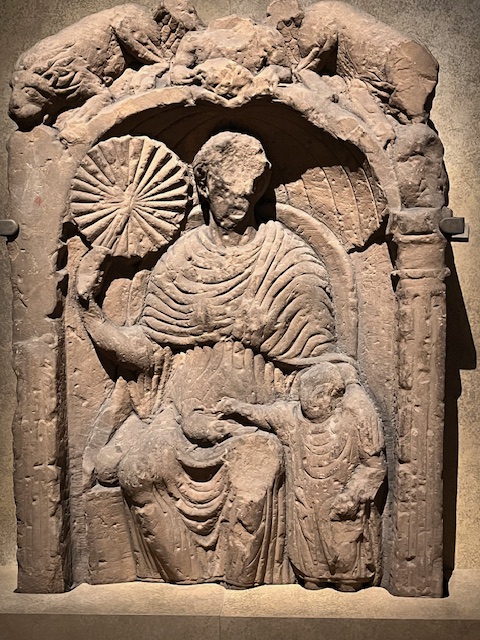 Another more impressive gravestone depicts a woman in impressive robes and holding a fan. Her other hand rests on a young child. It is a relaxed and yet regal image. This is performative luxury and presents an alluring image of life at the Northern fringes of the Roman empire. Yet how much was real.