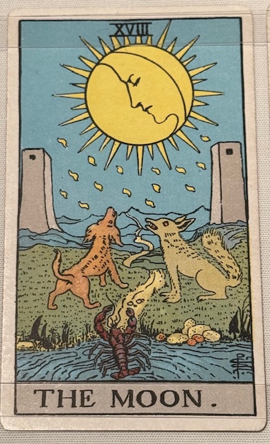 A design for the Moon card, now in Palermo, painted in the early 1920s during his ill-fated attempt to set up a religious commune of Sicily, shows two jackals. One pale and one dark. Earlier packs had shown two dogs with tongues, licking the lunar beams.