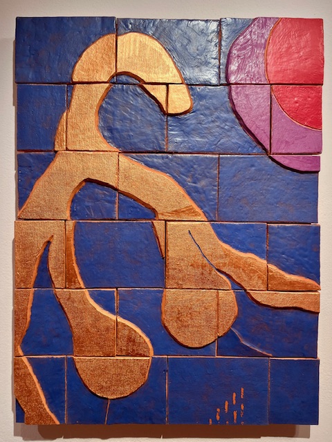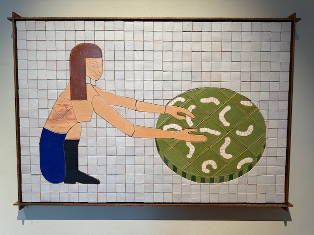 This was the first showing of her important new work Enjoy Life More (2024), created from 21 glazed earthenware tiles, depicting a shape in gold against a blue background, combining the iconography of ancient Egyptian goddesses and the anatomy of the clitoris.